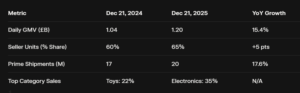 Holiday Drivers : Building on Prime Day 2025’s $24.1 billion U.S. haul (42% electronics growth), UK AI tools enhanced seller efficiency by 25%.